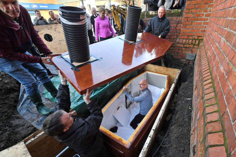 Eşine elveda öpücüğü vererek toprağa gömülen yaşlı adam, böyle tuhaf bir girişimde bulunmasının nedenini; ‘uyuşturu – alkol bağımlılığı, yeme bozukluğu ve intihara yatkınlığı olan insanlar' için farkındalık yaratmak olduğunu ifade etti.